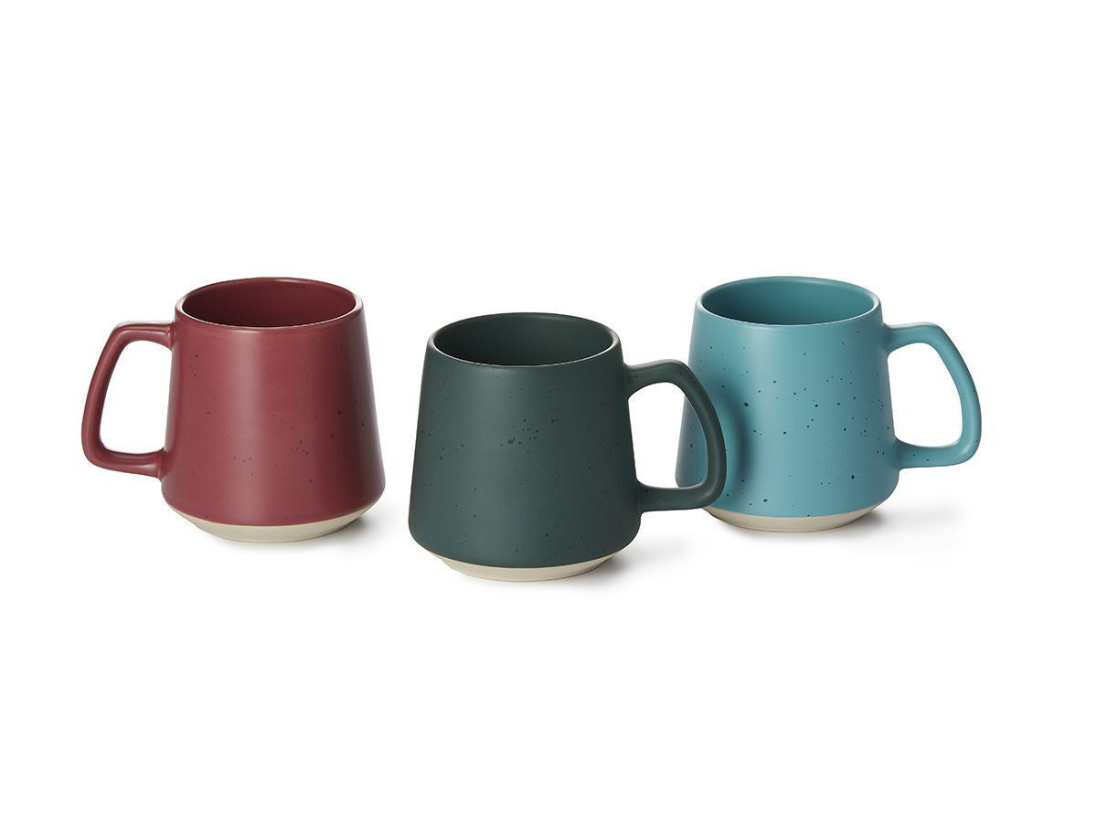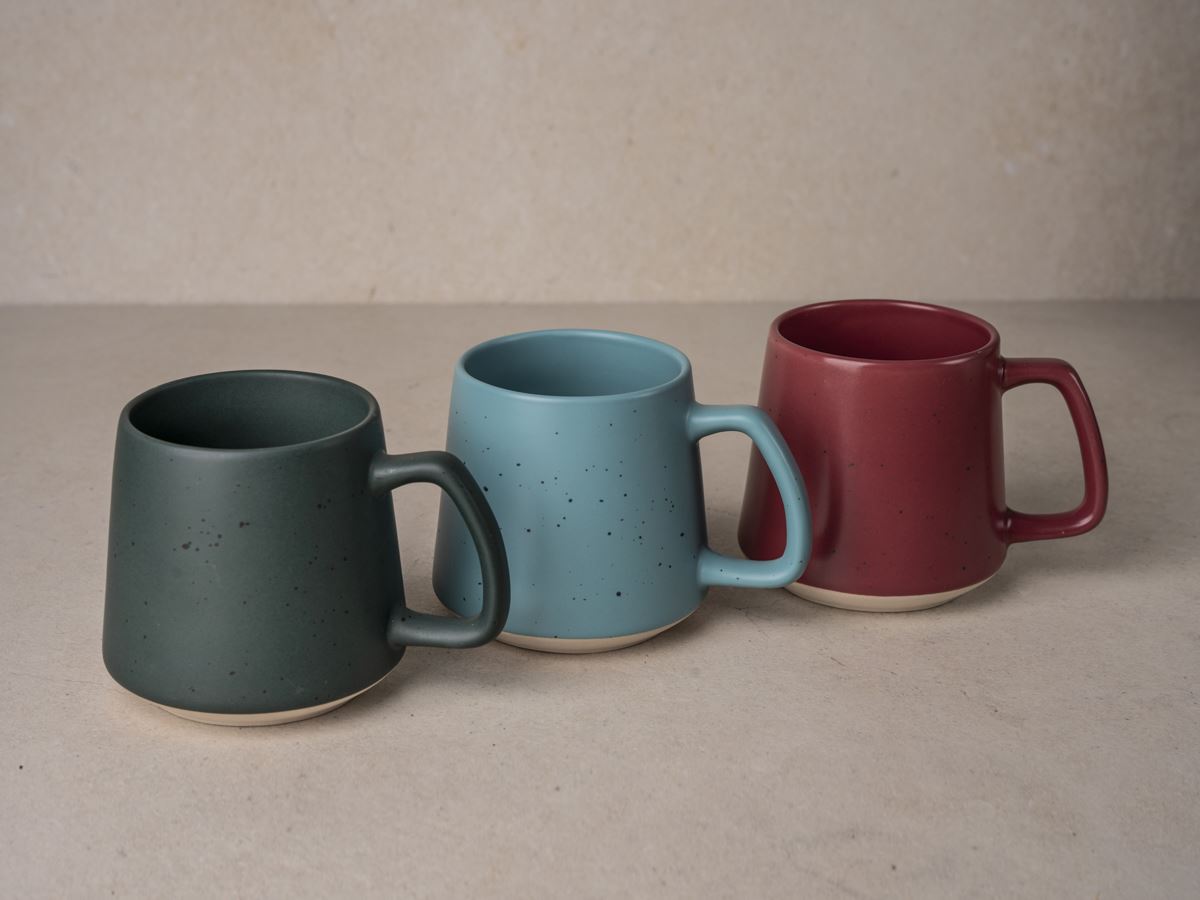Alle guten Dinge sind drei! Und so überrascht dieser schöne Becher mit gleich 3 verschiedenen Farben in einer Verkaufseinheit, die für maximale Vielfalt auf Ihrem heimischen Küchentisch sorgen. Doch welcher Ton ist Ihr Favorit? Ist es die satte Beerenfarbe, das dunkle Tannengrün, oder das tiefe Türkisblau? Für uns ist klar, dieser Farbmix bietet den passenden Becher für jede Lebenslage. Ob einzeln oder im Team, die Farben sind so aufeinander abgestimmt, dass sie ideal miteinander harmonieren aber auch allein Strahlkraft entfalten. Um die volle Wirkung dieser einzigartigen Farbwelt bestmöglich in Szene zu setzen, erstrahlen sowohl die Becheraußenseite, die -innenseite und der Henkel in den schönen Farbtönen. Die matte Oberflächenveredelung verleiht diesen hierbei einen hochwertigen und besonders exquisiten Touch. Der Sockel in beiger Zementoptik, sowie unregelmäßig arrangierte, schwarze Kleckse geben dem Artikel einen handcrafted look und bilden so eine schöne Verbindung zu den von der Natur inspirierten Farbtönen. Mit einer mittleren Füllmenge von 0,35 l eignet sich der Becher für den Genuss der meisten Heißgetränke. Die moderne Form und der große Henkel sorgen für ein angenehmes Nutzererlebnis.