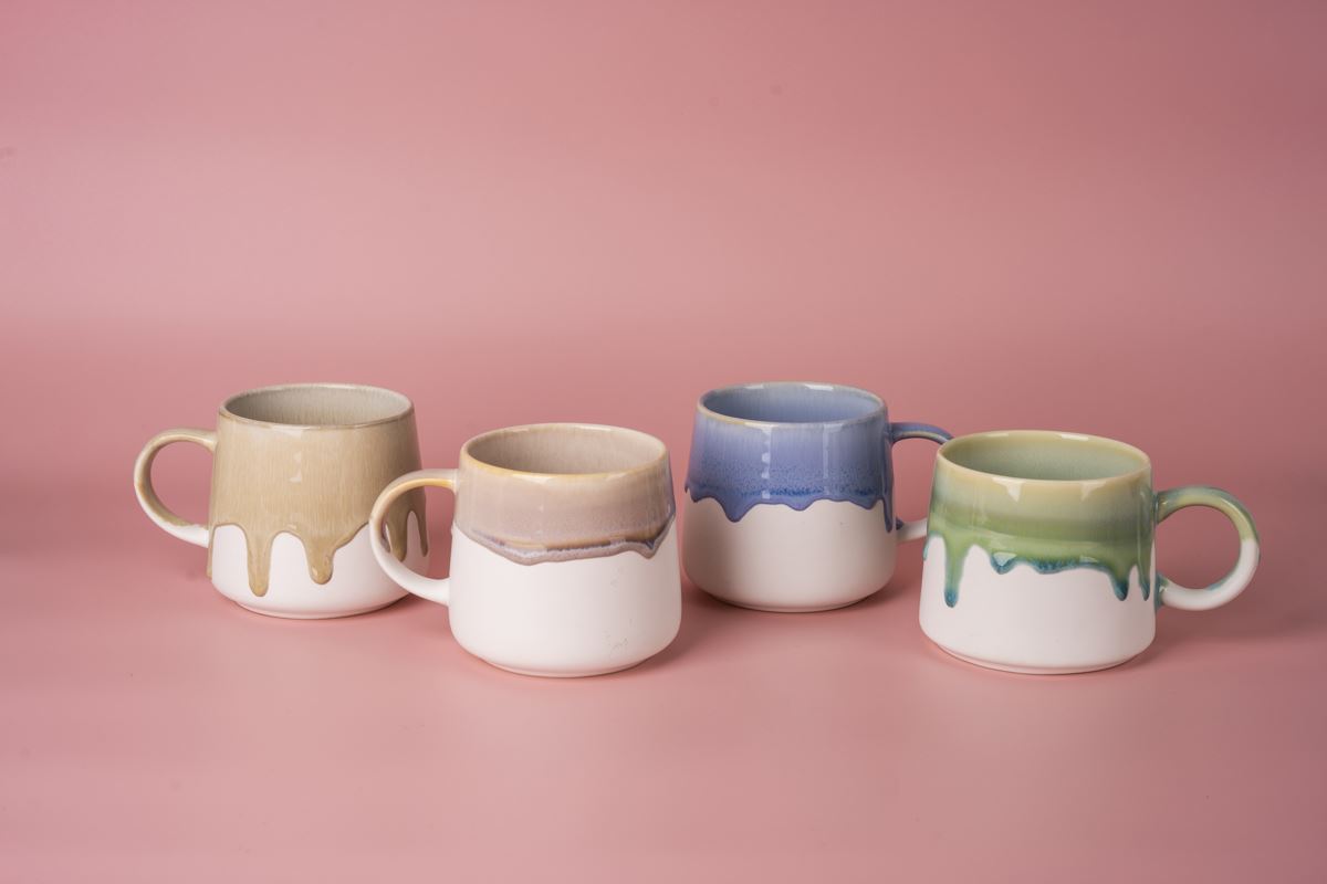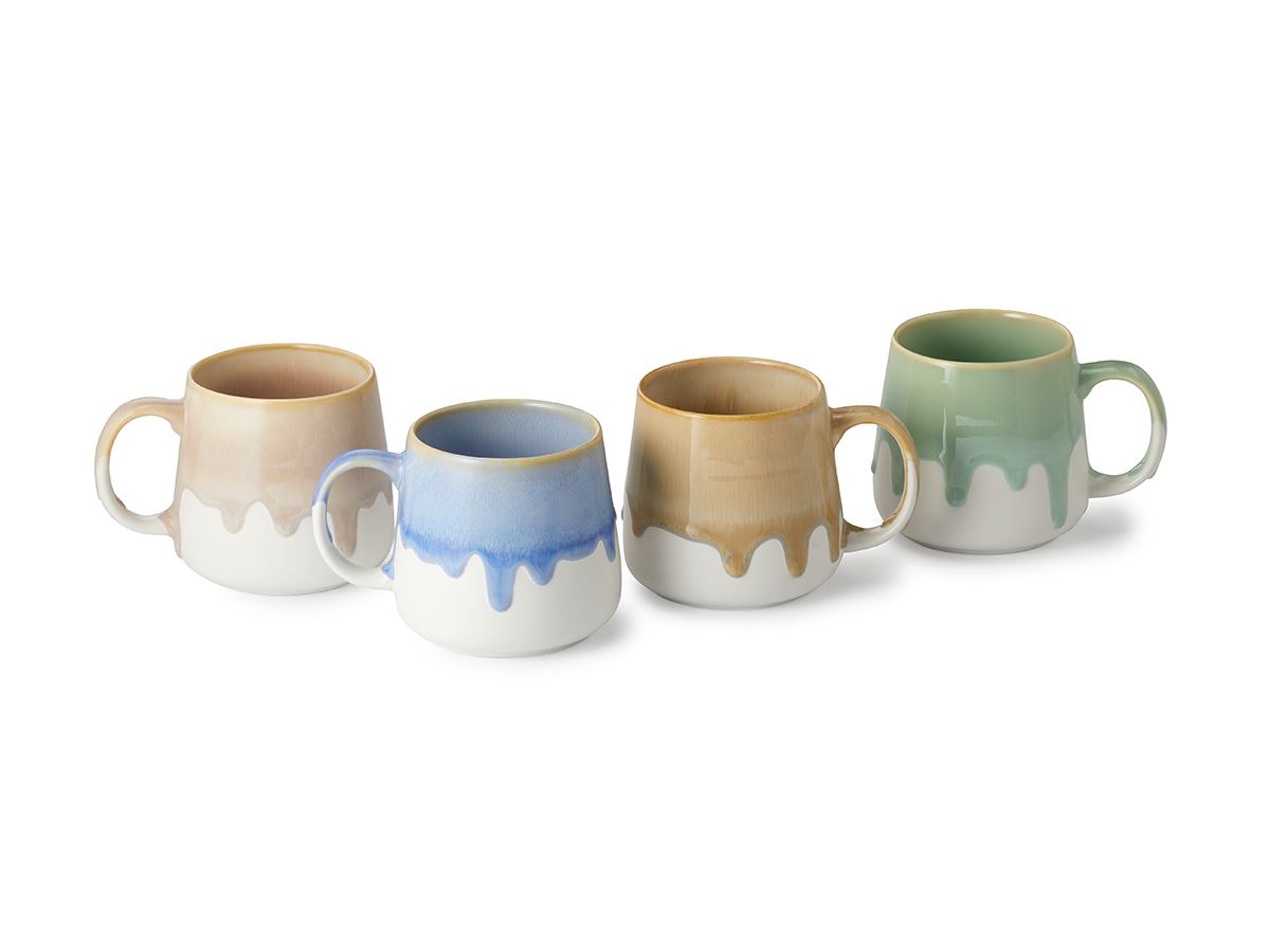 Wie im Schlaraffenland, wo Milch und Honig fließen, erinnert die außergewöhnliche Reactive Glaze dieses Bechers durch ihre einzigartige Drip-Optik an leckeres, schmelzendes Karamell oder süßen Zuckerguss! Läuft Ihnen auch schon das Wasser im Mund zusammen? Die schöne Reactive Glaze entsteht durch oxidationsprozesse während des Brennens und sorgt für aufregende Farbverläufe die jeden Becher zu einem Unikat machen. Und so wird dieser Artikel zu einem echten Hingucker mit Alleinstellungsmerkmal, inspiriert vom angesagten Backtrend der Drip-Cakes und somit der perfekte Begleiter für den Genuss von Tee oder Kaffee zu einem leckeren Stück Kuchen! Die vier fein aufeinander abgestimmten Farben sorgen hierbei für muntere Abwechslung auf dem Tisch und bieten Ihnen maximale Vielfalt für Ihr Sortiment. Die moderne Artikelform liegt angenehm in der Hand und sorgt so für angenehme Wohlfühl- und Genussmomente. Einfach ein rundum gelungener Artikel zum Dahinschmelzen!