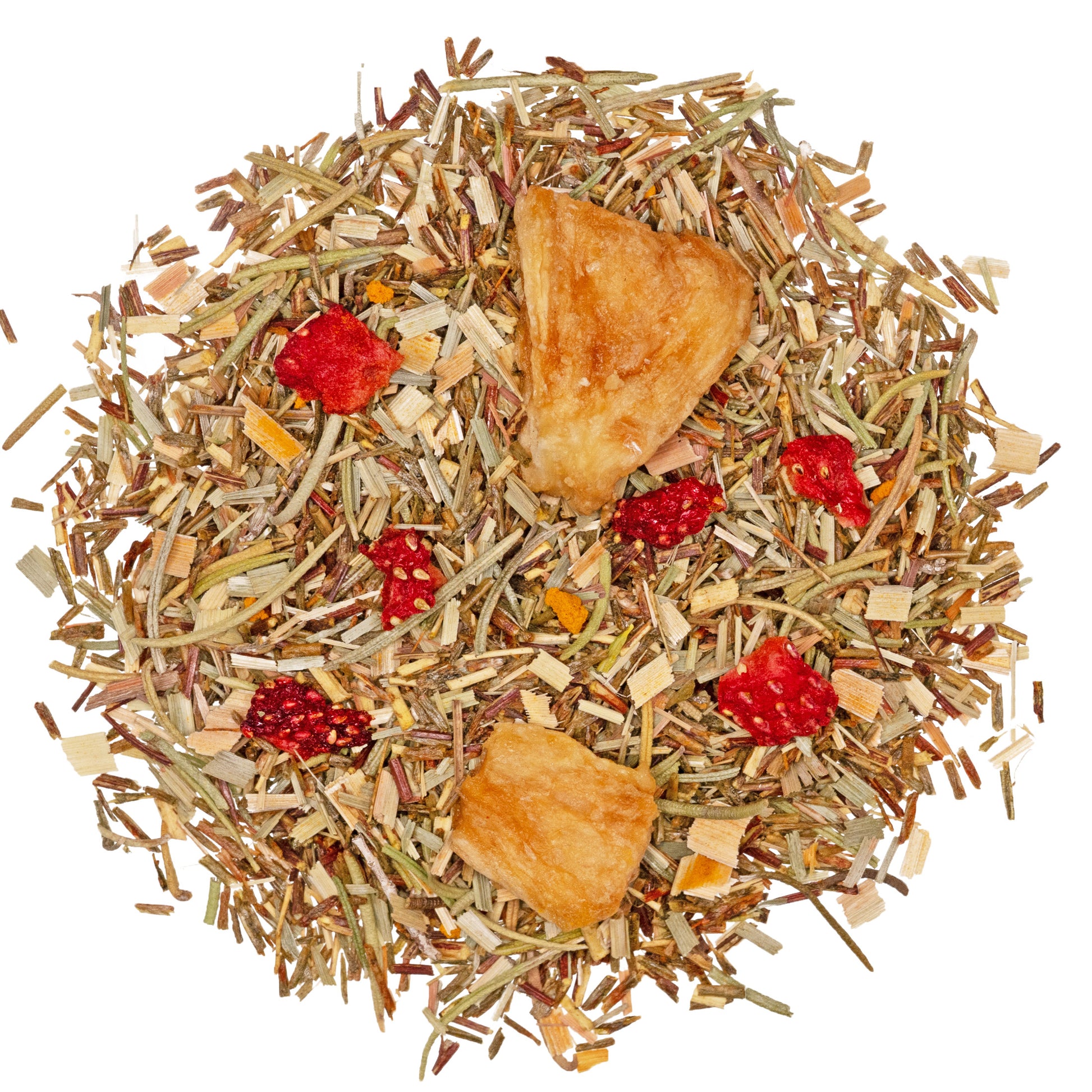 Zutaten: Grüner Rooibos*, Lemongras*, Rosmarinblätter*(13,5%), natürliches Ananas-Aroma, Ananaschips*(4%), Kurkumawurzel*, Erdbeerstücke, natürliches Sahne-Aroma(enthält Milch)