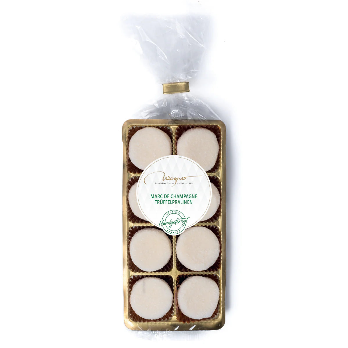 Genießen Sie unsere Erlesenen Marc de Champagne Trüffelpralinen. Dieser Trüffel besticht durch seine cremige Trüffelmasse abgerundet mit „Marc de Champagne“, umhüllt von zartschmelzender weißer Schokolade welche nochmals mit feinem Kristallzucker ummantelt ist.
