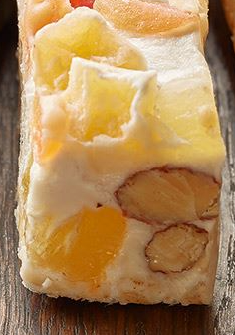 Zucker, Glukosesirup, Mandeln, getrocknete Papaya (Papaya, Zucker, Konservierungsmittel: Schwefeloxid), getrocknete Ananas (Rohrzucker, getrocknete Ananas, Säuerungsmittel: Citronensäure, Konservierungsmittel: Schwefeloxid), Zuckersirup, Haselnüsse, Oblaten (Kartoffelstärke, Wasser, pflanzliches Öl), Eiweißpulver, Gelatine, natürliches Orangenaroma
