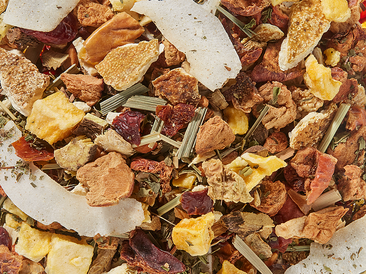 Zutaten: Apfelstücke*, Hagebuttenschalen*, Orangenschalen*, Ingwerstücke*, Süßholzwurzeln*, gefr.-getr. Mangowürfel*, Kokoschips*, Spearmint*, Zitronengras*, Orangenöl*, natürliches Bourbon-Vanille-Extrakt*, natürliches Tonka-Aroma, *k.b.A. - aus kontrolliert biologischem Anbau.