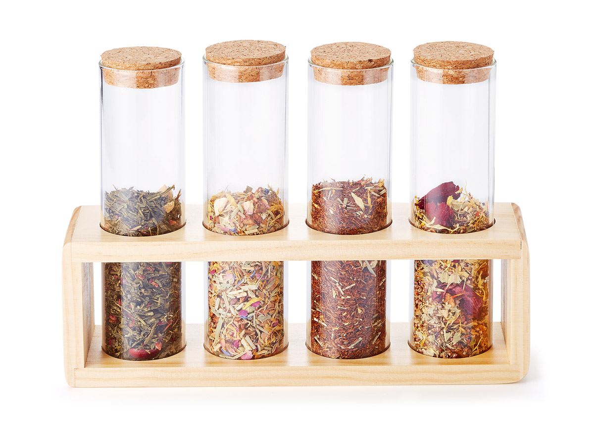 - 4 Gläser mit Korken im Holzständer Gläser: 0,25 l