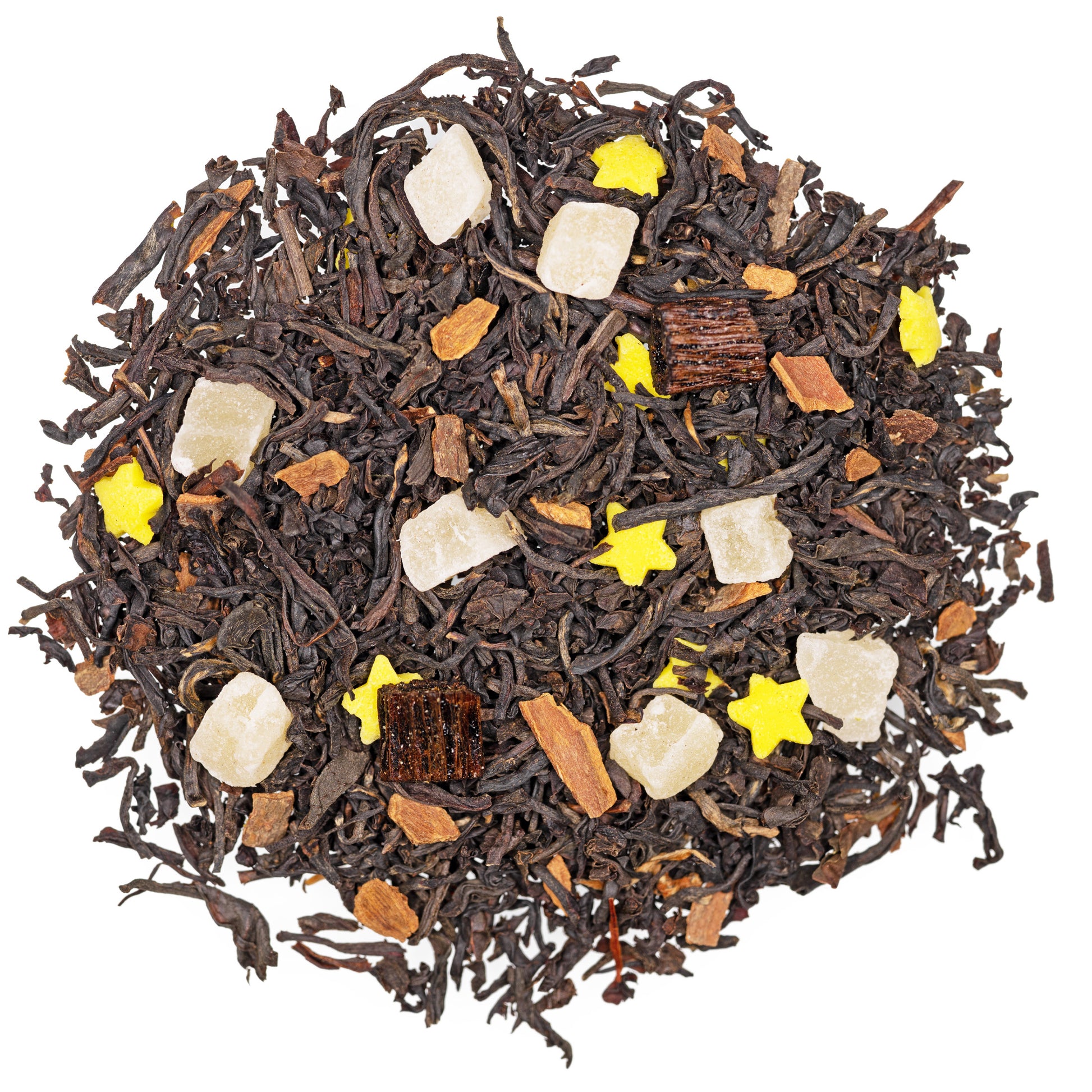 Zutaten: Schwarzer Tee, kandierte Mangostücke (Mango, Zucker), gelbe Zuckersterne (Zucker, Reismehl, Rapsöl, Kartoffelstärke, Farbstoff: Kurkumin), natürliches Aroma, Zimtrinde(4%), Vanillestücke(1%)