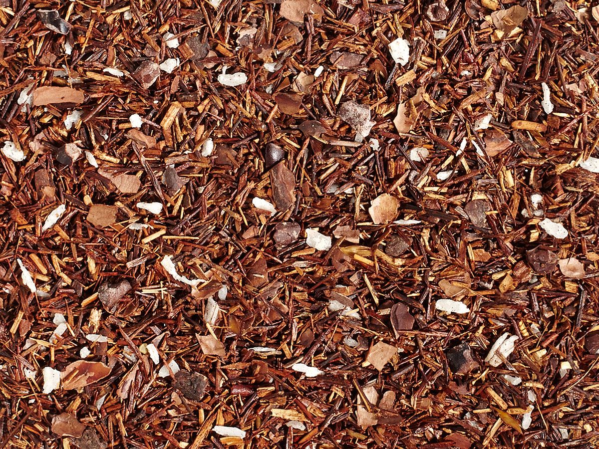 Zutaten: Rotbuschtee, Kakaoschalen, Kakaobruch, Kokosraspeln, Aroma