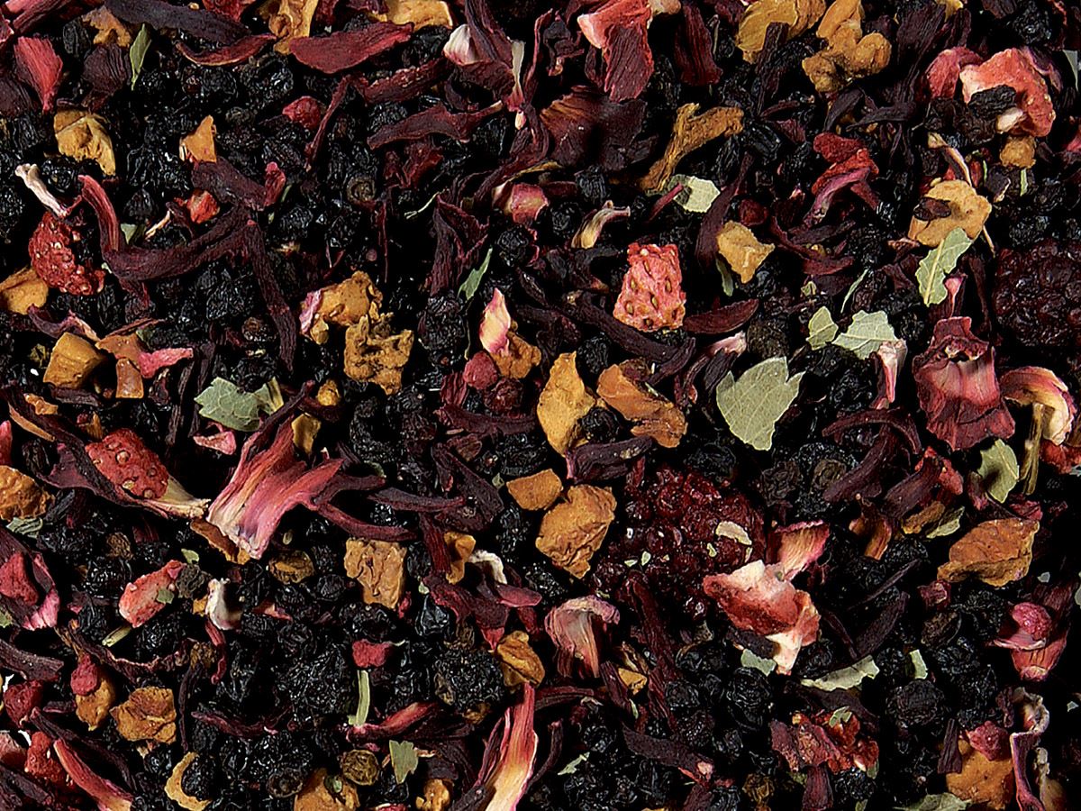 Zutaten: Fliederbeeren, Hibiskusblüten, Apfelstücke, schwarze Johannisbeeren, Aroma, gefr.-getr. ganze Brombeeren, gefr.-getr. Erdbeerstücke, gefr.-getr. Himbeerstücke, Walderdbeerblätter.